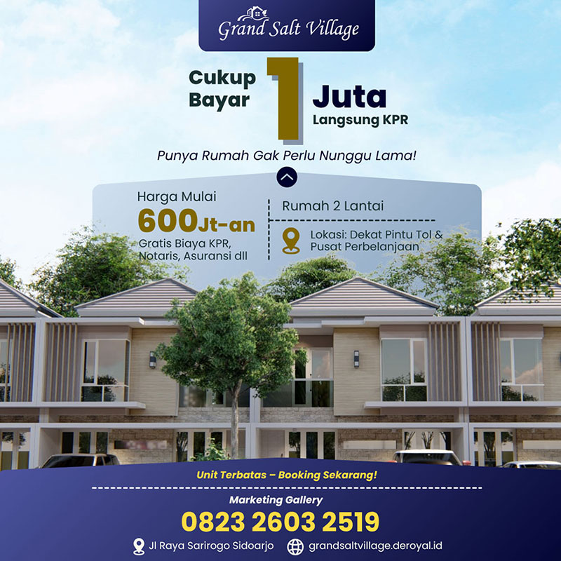 Hunian eksklusif dengan desain modern minimalis dan detail elegan. Dikelilingi lingkungan hijau yang menenangkan, Grand Salt Village adalah pilihan tepat untuk kamu yang mencari kenyamanan dan gaya hidup berkualitas di Sidoarjo.